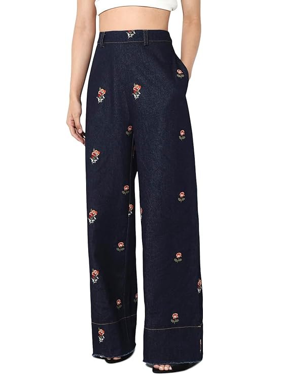 ONLY Women Straight Fit High-Rise Embroidered Cotton Denim Jeans